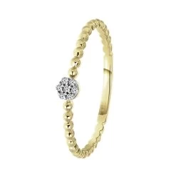 Deze schitterende damesring is gemaakt van 14 karaat geelgoud met 7 diamanten. In het midden van de ring zit een rondje die volledig is gezet met diamanten. De scheen van de ring bestaat uit kleine bolletjes. Het totaalgewicht van de diamanten is 0,025ct.