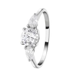 Deze 9 karaat witte ring is voorzien van drie zirkonia stenen waarvan de twee kleine zirkonia stenen een druppel vorm hebben.