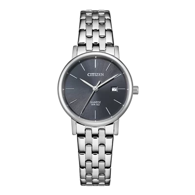 Dit Citizen horloge is gemaakt van staal en heeft een donkergrijze wijzerplaat. De waterdichtheid van dit horloge is 5 atm (douchen)