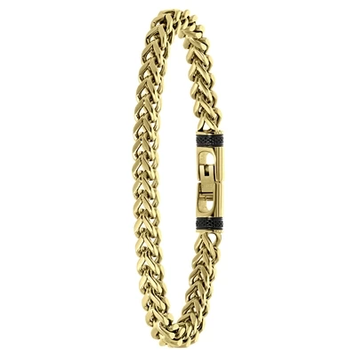 Gerecycled staal – Deze mooie goldplated herenarmband is gemaakt van het materiaal staal en heeft een vossenstaartschakel. De uiteinden van deze brede armband hebben een zwart detail.