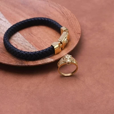 Gerecycled Stalen Goldplated Herenring Met Leeuwenkop