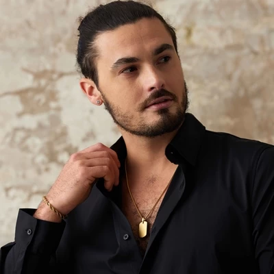 Gerecycled staal – Deze stalen goldplated heren ketting heeft een plaathanger. De ketting heeft een matte afwerking. De ketting heeft een lengte van 60cm en een verlengstuk van 5cm.