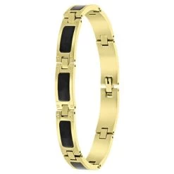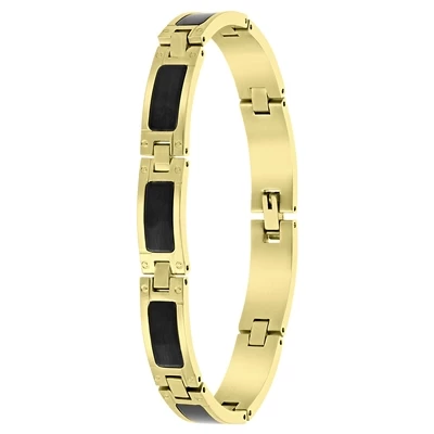 Gerecycled staal – Deze mooie goldplated herenarmband is gemaakt van het materiaal staal en heeft fantasieschakels met een zwart accent. Dit geeft de armband een stoer effect.