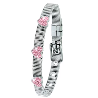 Gerecycled staal – Little Miss Fabulous – Deze mooie mesh armband is gemaakt van het materiaal staal. Aan de armband zitten drie harten die bezet zijn met schitterende kristal stenen. Verkrijgbaar in veschillende kleuren!