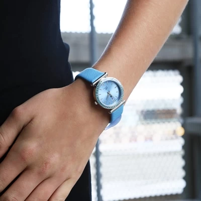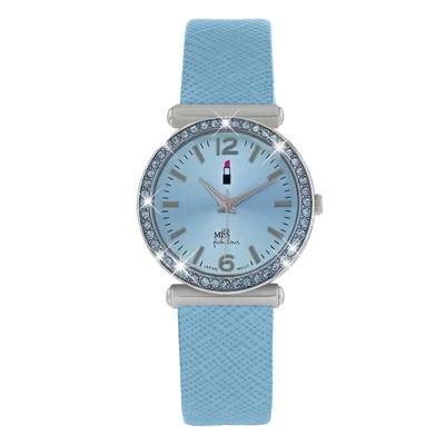 Schattig horloge voor meisjes van het merk Little miss fabulous. Het horloge heeft een leren band en een blauwe wijzerplaat. De wijzerplaat is rondom versierd met schitterende steentjes.