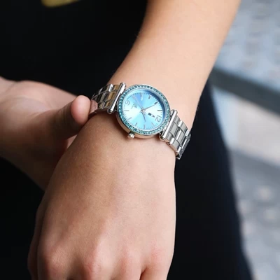 Schattig horloge voor meisjes van het merk Little miss fabulous. Het horloge heeft een stalen band en een blauwe wijzerplaat. De wijzerplaat is rondom versierd met schitterende steentjes.