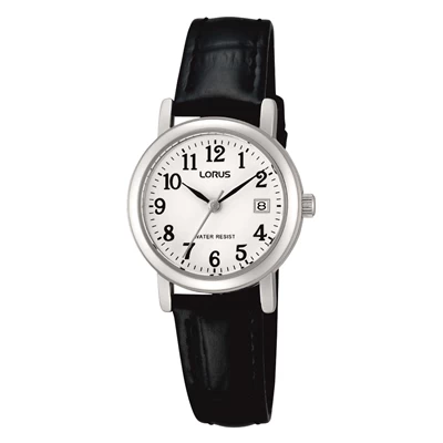 Dit mooie Lorus dames horloge met stalen kast en zwarte leren band heeft een witte wijzerplaar en zilverkleurige kast. De wijzerplaat is voorzien van een datumaanduiding en de kast heeft een diameter van 26 millimeter.