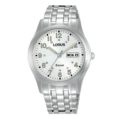 Lorus heren horloge met witte wijzerplaat, het horloge is 50 meter waterdicht en met duidelijk af te lezen cijfer index en dag/datum functie.
