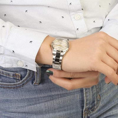 Elegant en tijdloos dames horloge van het merk Pulsar. Het horloge heeft een zilverkleurige stalen band. De wijzerplaat en het kroontje zijn versierd met goudkleurige elementen. Het horloge is 50 meter waterdicht en de kast heeft een diameter van 30 millimeter.