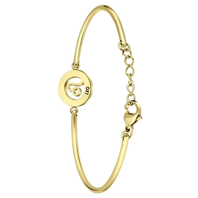 Deze hippe stalen goldplated armband heeft een ronde disc met daarop één van de sterrenbeeld tekens, Leeuw. De armband is 16 centimeter lang en heeft een verlengstukje van 4 centimeter. De leeuw is het vijfde teken in het dierenriem. Je sterrenbeeld ook wel zonneteken schetst de kern van je persoonlijkheid. Enkele eigenschappen zijn loyaal en moedig.