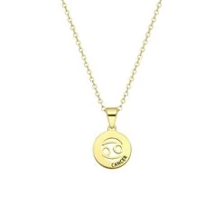 Deze hippe stalen goldplated ketting heeft een ronde disc met daarop één van de sterrenbeeld tekens, Kreeft. De ketting is 42 centimeter lang en heeft een verlengstukje van 5 centimeter. De kreeft is het vierde teken in het dierenriem. Je sterrenbeeld ook wel zonneteken schetst de kern van je persoonlijkheid. Enkele eigenschappen zijn empathisch, streberig en creatief.
