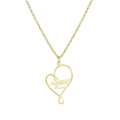 Deze mooie naamketting is gemaakt van het materiaal staal en heeft een laagje 18k goldplating. De hanger heeft de vorm van een hart. In de hanger worden 3 namen uitgesneden. LET OP: Dit artikel wordt speciaal gemaakt op bestelling.