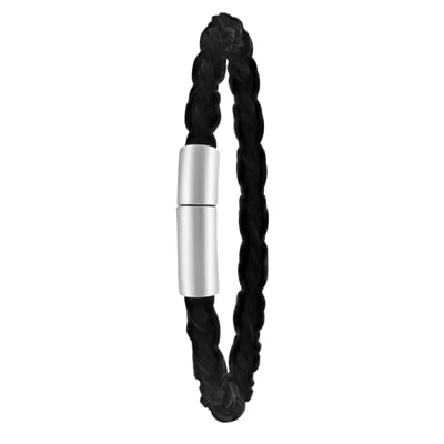 Deze mooie herenarmband is gemaakt van het materiaal staal en heeft een ronde gevlochten zwarte leren band en een stalen sluiting. Deze armband is mat afgewerkt wat een stoere uitstraling geeft. De armband is 6mm breed.