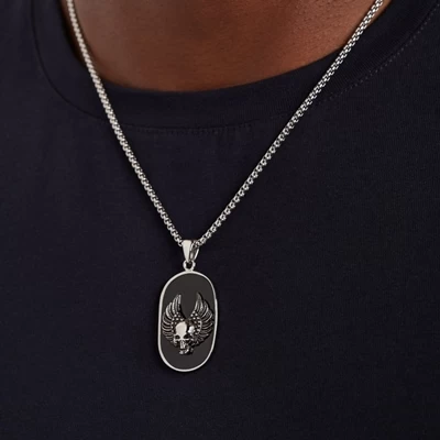 Deze ruige ketting heeft een ovale hanger met daarop een doodskop met vleugels. De hanger is afgewerkt met zwarte emaille.