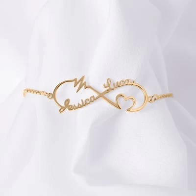 Deze mooie naamarmband infinity heeft een open hart en een heartbeat. De armband is gemaakt van het materiaal staal en heeft een laagje 18k goldplating. LET OP: Dit artikel wordt speciaal gemaakt op bestelling.