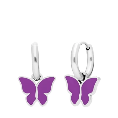 Deze schattige oorbellen zijn gemaakt van het materiaal staal en hebben een vlinder als hanger. De vlinder is afgewerkt met emaille in de kleur violet.