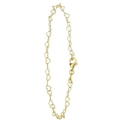 Deze armband is gemaakt van zilver met een 18 karaat goldplating en heeft een fijne schakel van open hartjes. Dit sieraad heeft een lengte van 18,5 cm.