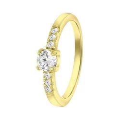 Deze mooie goldplated kinderring is gemaakt van het materiaal zilver en is bezet met prachtige witte zirkonia steentjes. De grootste steen in het midden is ongeveer 4 mm bij 4 mm. Deze ring is verkrijgbaar in verschillende maten en is leuk te combineren met onze andere sieraden.