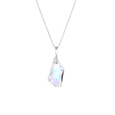 Deze zilveren ketting van 45 cm lang en heeft een hoekige hanger van kristal AB.