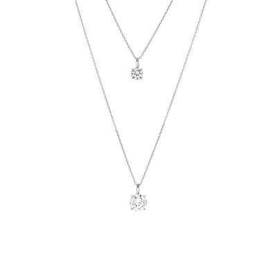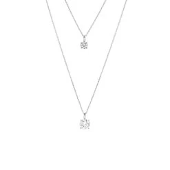Deze dubbele ketting is gemaakt van het materiaal zilver. Aan beide kettingen hangt een zirkoniasteen.