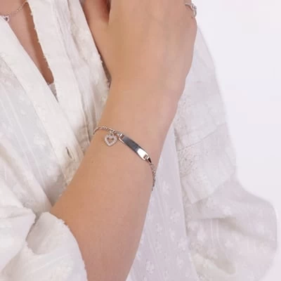 Deze prachtige kinderarmband is gemaakt van het materiaal zilver en heeft een plaatje en een hanger in de vorm van een hartje. Het hartje is bezet met licht roze zirkonia steentjes.