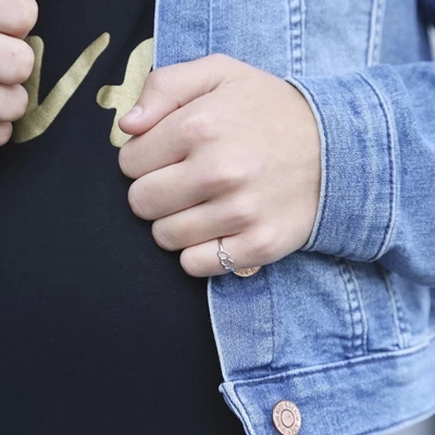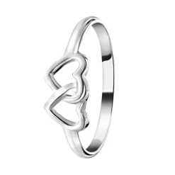 Deze zilveren ring heeft twee in elkaar gehaakte hartjes aan de voorkant.