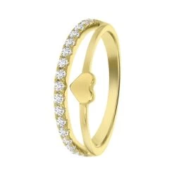 Deze mooie dubbele goldplated kinderring is gemaakt van het materiaal zilver. De ring is versierd met een hartje en is bezet met schitterende zirkonia steentjes. Het hartje is ongeveer 3mm bij 4,5 mm. Deze prachtige ring is verkrijgbaar in verschillende maten.