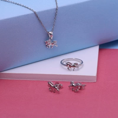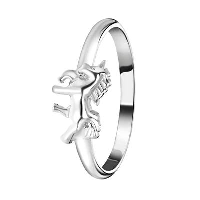 Deze zilveren kinderring heeft een paardje aan de voorkant. De ring is verkrijgbaar in verschillende maten.