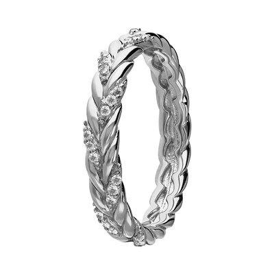 Deze zilveren ring is gevlochten en heeft meerdere zirkoniasteentjes.